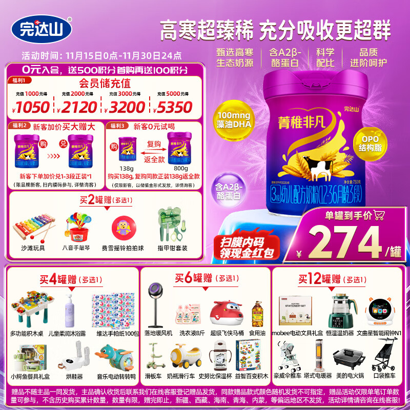 完达山(wondersun)新国标菁稚非凡A2-酪蛋白幼儿配方奶粉3段750克(1-3岁适用)