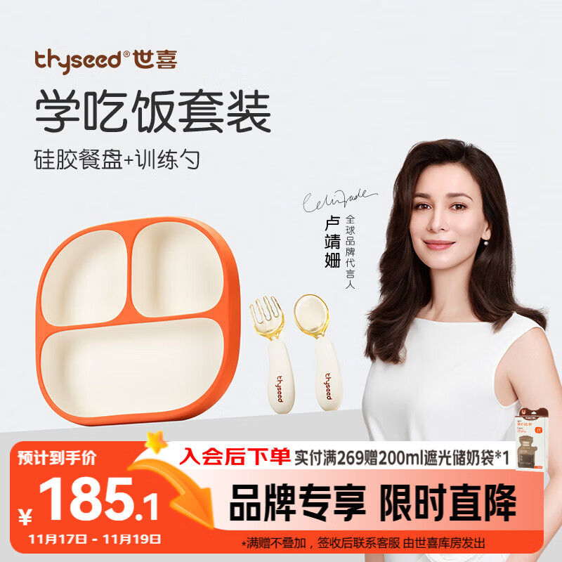 世喜婴儿餐盘分格带吸盘 宝宝训练弯弯辅食勺学吃饭叉子 儿童餐具套装
