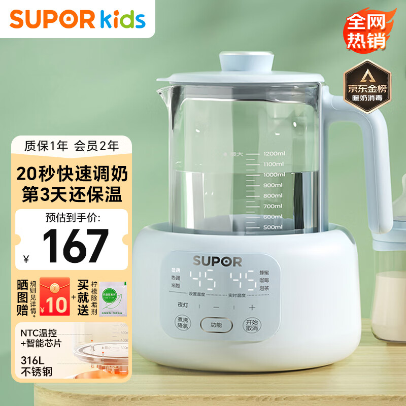 苏泊尔(SUPOR)恒温水壶 婴儿调奶器 泡奶粉机 玻璃热烧水壶家用养生壶1.2L BW07