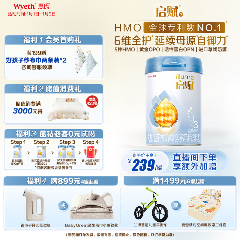 惠氏(Wyeth)启赋蓝钻【加量装】HMO幼儿配方奶粉3段(12-36月)850g