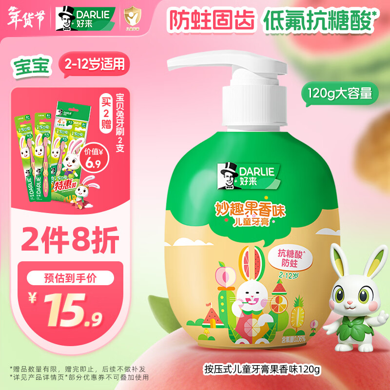 DARLIE好来(原黑人)按压式儿童牙膏2-3-6-12岁果香味120g抗糖酸防蛀含氟