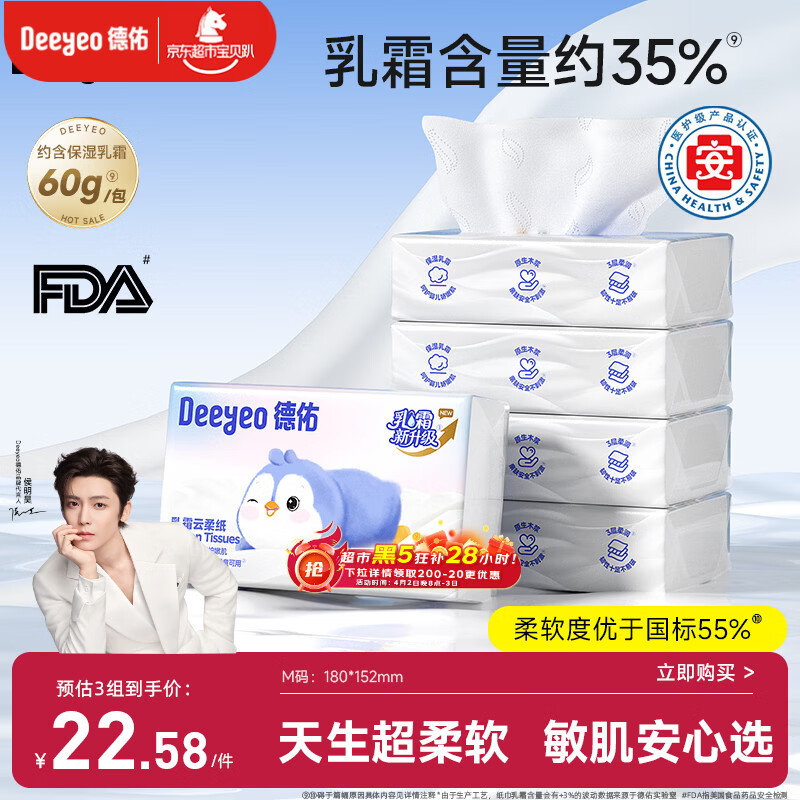 德佑云柔巾婴儿适用乳霜纸柔纸巾抽纸宝宝云柔巾120抽5包
