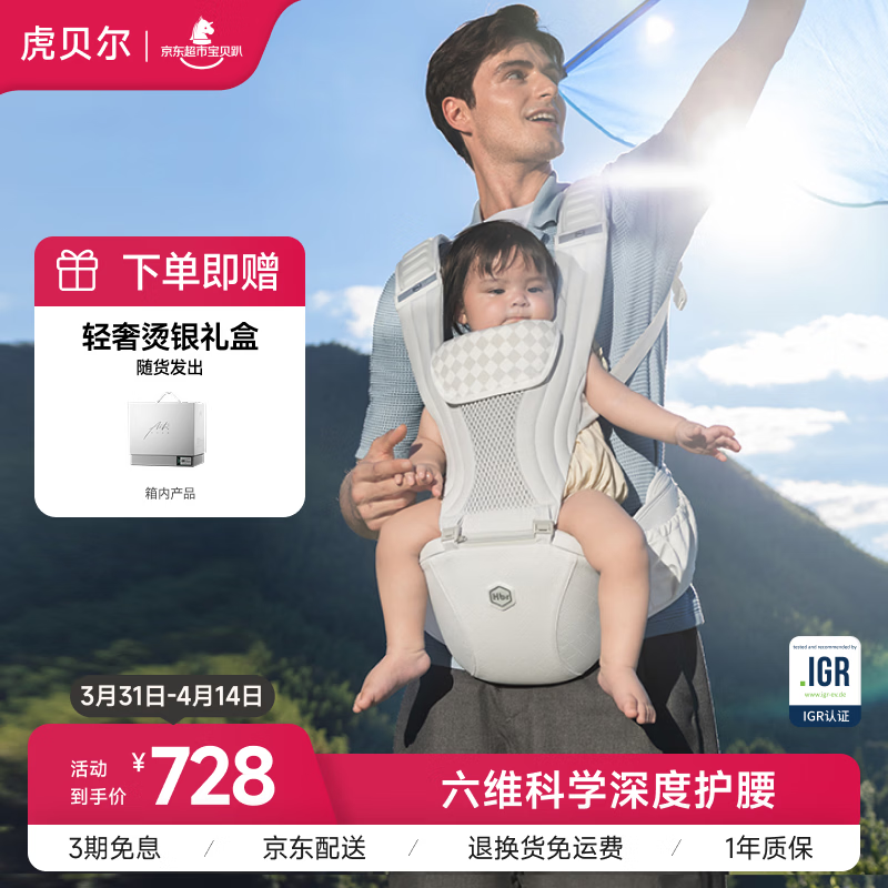 虎贝尔(HBR)Air Max深度护腰六维婴儿腰凳背带二合一轻便四季抱娃神器 银雾白