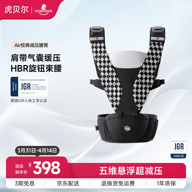 虎贝尔(HBR)Air经典减压腰凳五维婴儿背带轻便四季多功能抱娃神器 棋盘格黑白