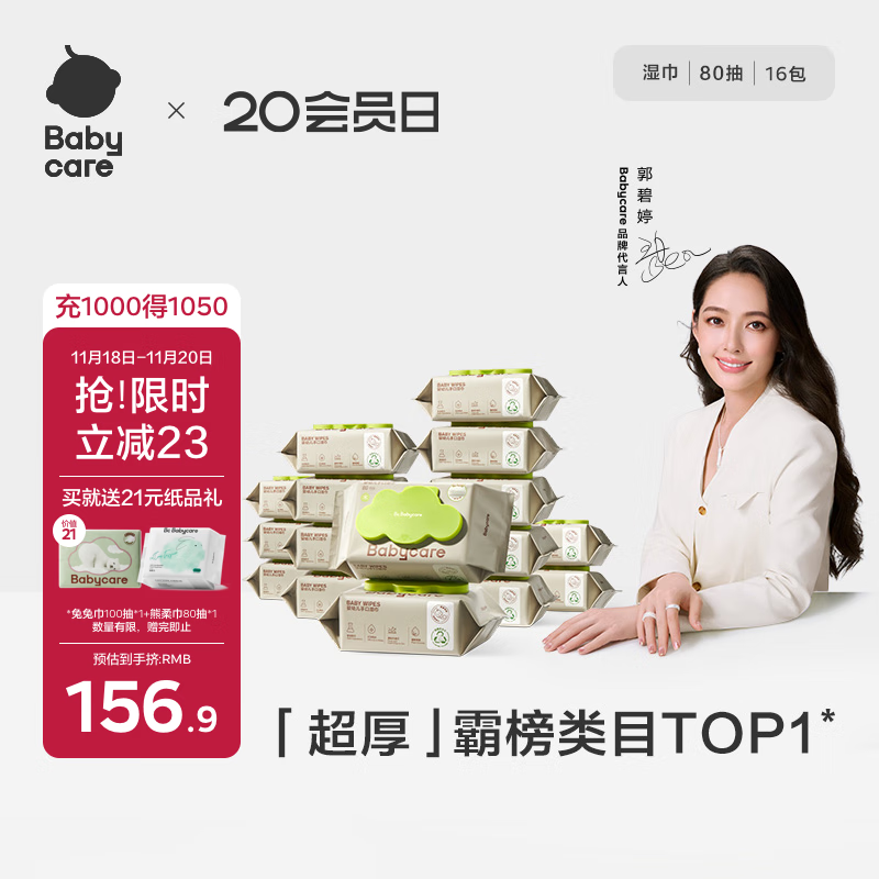 babycare婴儿手口湿巾新生儿湿纸巾带盖加厚擦脸3150绿盖湿巾80抽-16包
