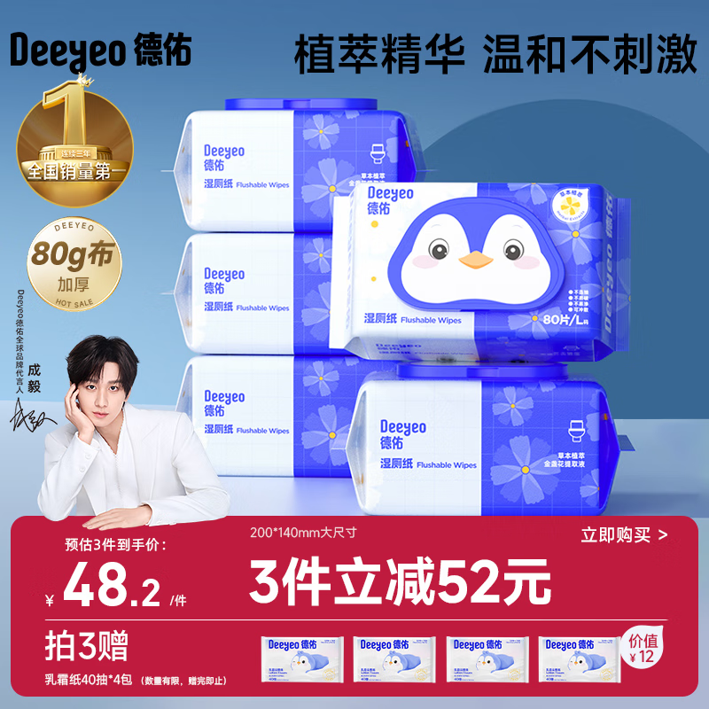 德佑湿厕纸金盏花家庭装80抽*5包厕所湿巾擦屁屁清洁湿纸巾婴童适用