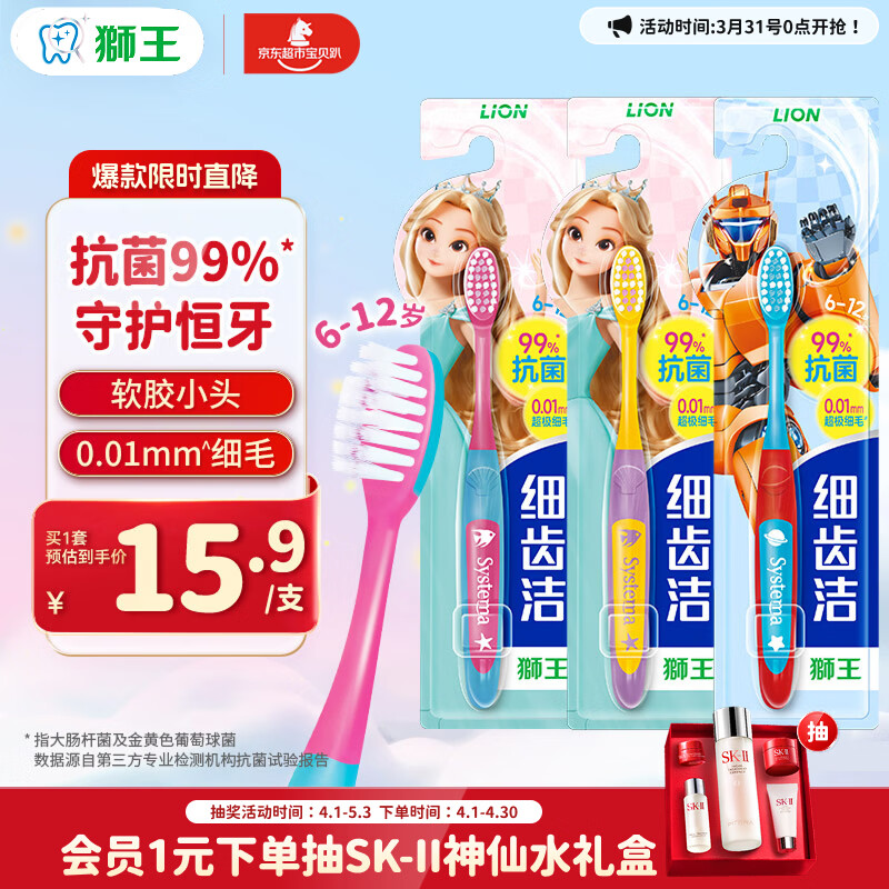 狮王(lion)细齿洁极细毛儿童牙刷双重适齿6-12岁以上3支颜色随机