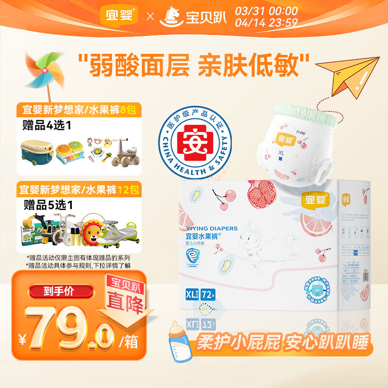 宜婴水果弱酸拉拉裤XL72片(11.5-13.5kg)婴儿尿不湿超薄透气干爽尿裤