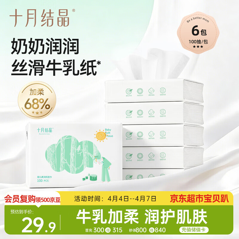 十月结晶婴儿云柔巾 100抽*6包新生儿专用乳霜纸添加牛乳精华超柔保湿