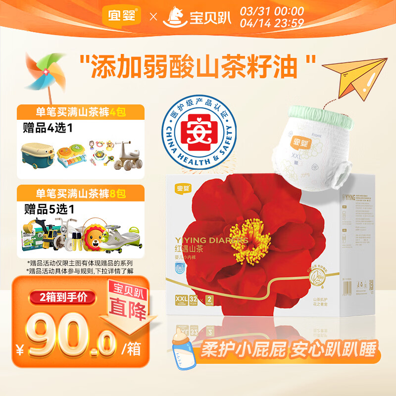 宜婴红花山茶裤 XXL64片 弱酸拉拉裤 护臀尿不湿透气纸尿裤【整箱】
