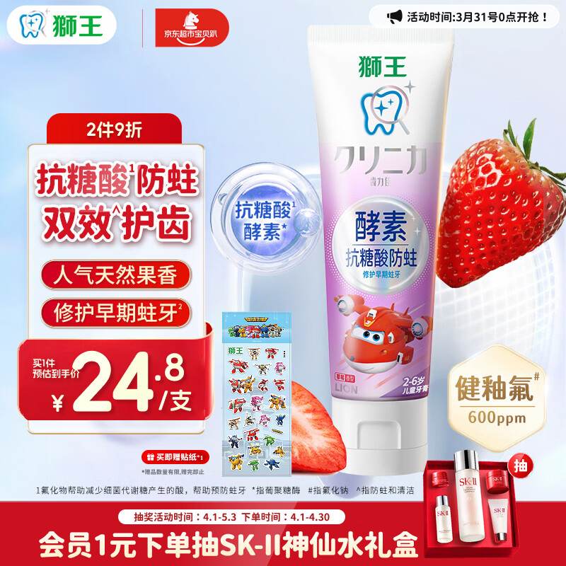 狮王(lion)齿力佳儿童酵素抗糖防酸蛀牙膏含氟2-6岁草莓味60g