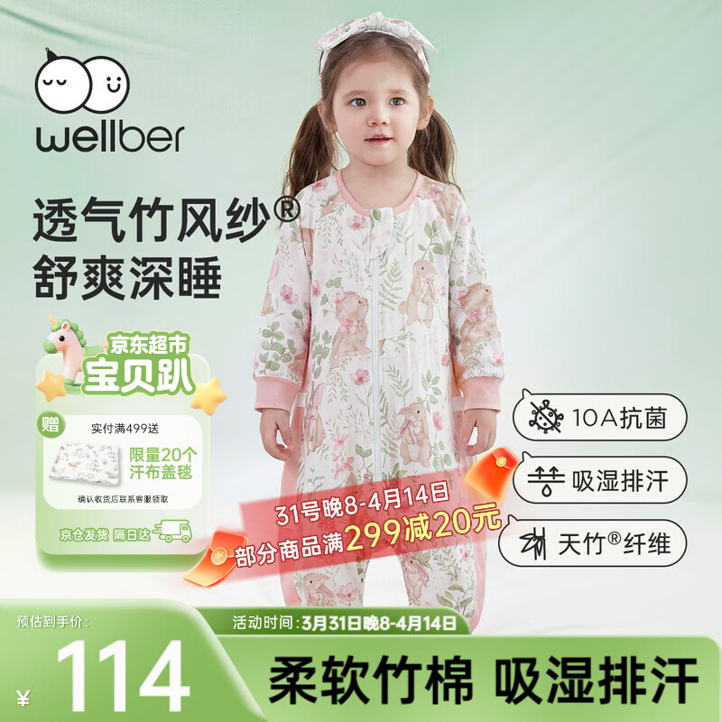 威尔贝鲁(WELLBER)【吸湿排汗】婴幼儿童睡袋1-3岁宝宝前6后4睡衣亲肤春夏 樱野粉M