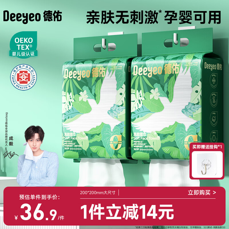 德佑洗脸巾160抽*2提壁挂式加大加厚干湿两用一次性棉柔洁面绵柔巾