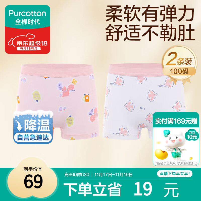 全棉时代儿童内裤女童平角裤宝宝全棉中大童内裤 松鼠+小鸟 100cm