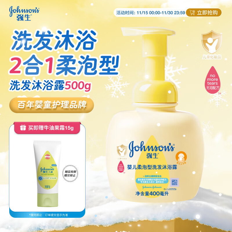 强生(Johnson)婴儿柔泡沐浴露洗发水二合一400ml 新生儿宝宝儿童泡沫洁净易冲洗