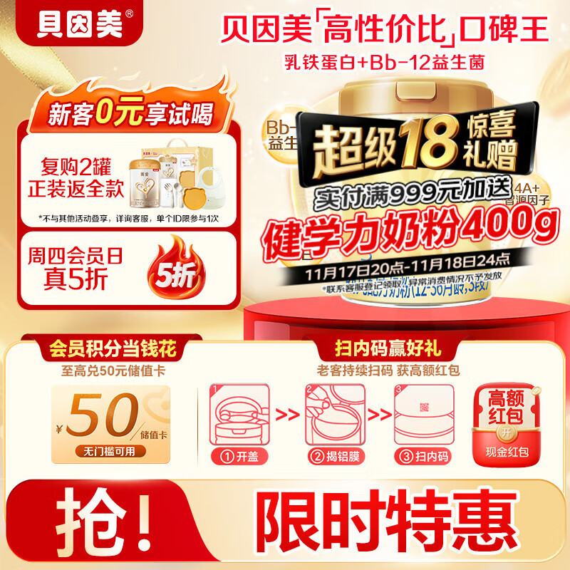 贝因美菁爱12-36月幼儿配方奶粉大罐3段800g 骨骼发育消化吸收含益生菌
