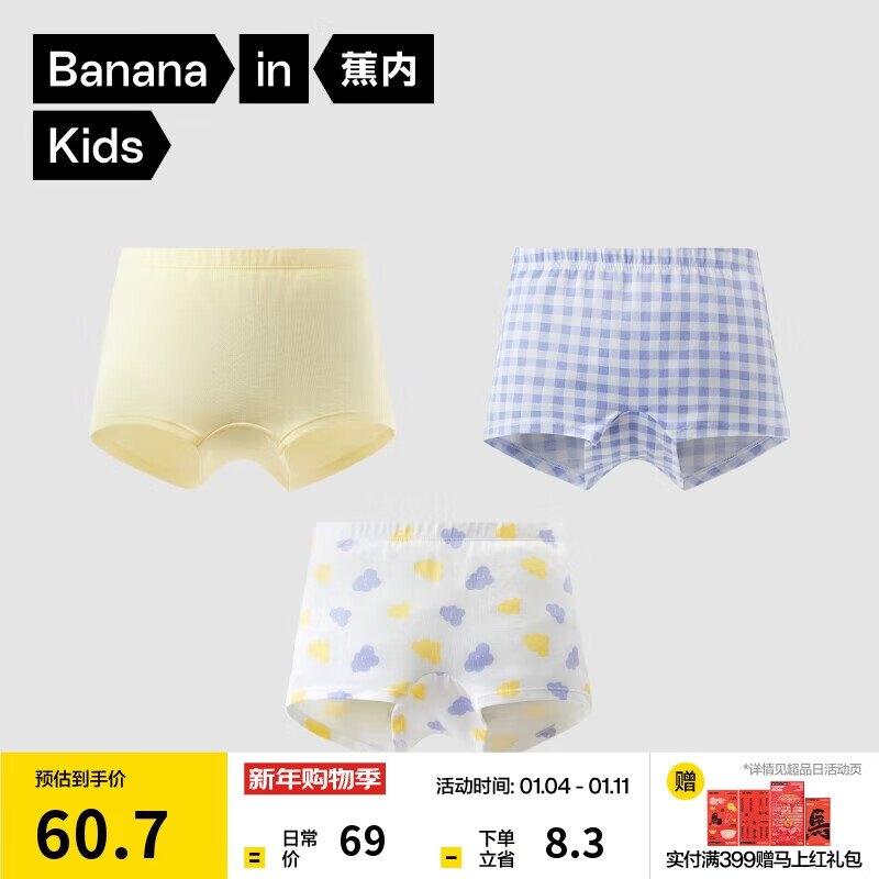 蕉内小特护301C儿童内裤A类男女童平三角7A抗菌棉裆透气亲肤高弹3件装