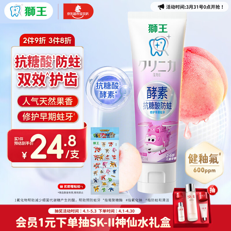 狮王(lion)齿力佳儿童酵素抗糖防酸蛀牙膏2-6岁蜜桃味60g