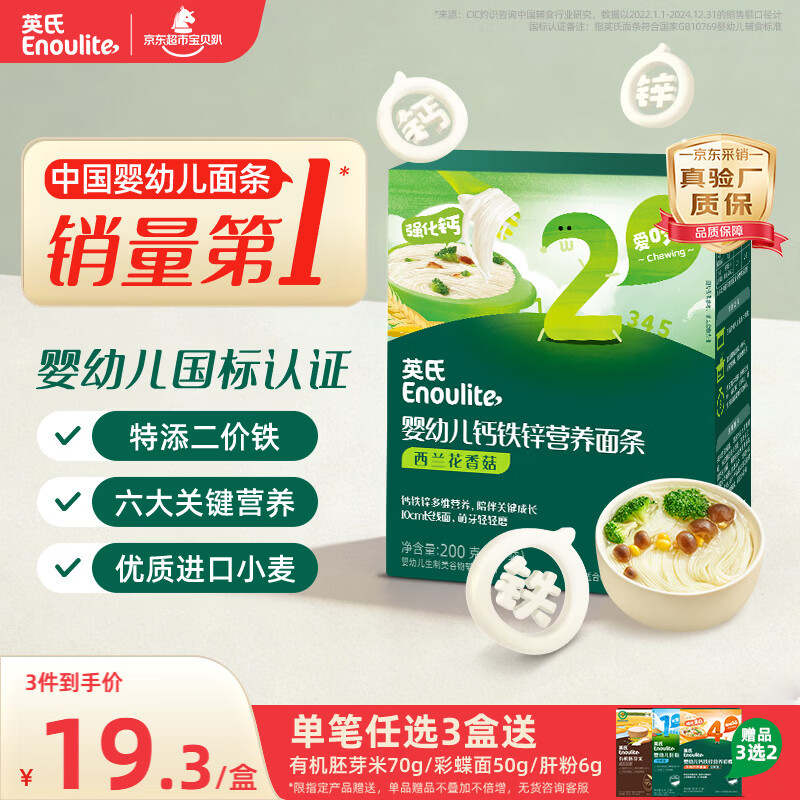 英氏婴幼儿面条西兰花香菇味200g 婴儿辅食儿童早餐营养长直面 真验厂