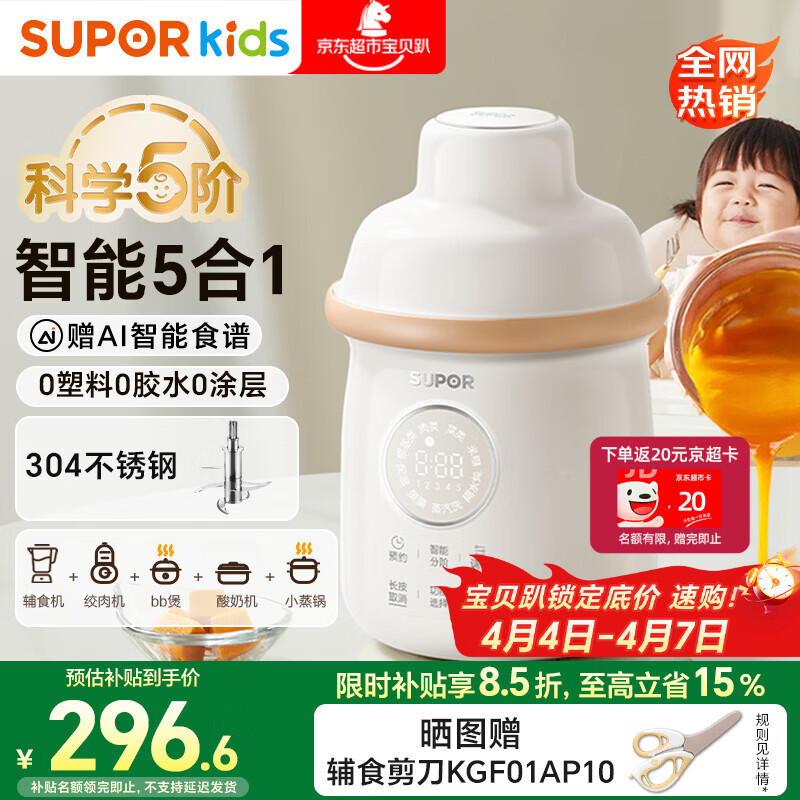 苏泊尔(SUPOR)辅食机婴儿米糊辅食料理机 蒸煮搅炖一体5阶分月龄 6叶全钢刀FB18