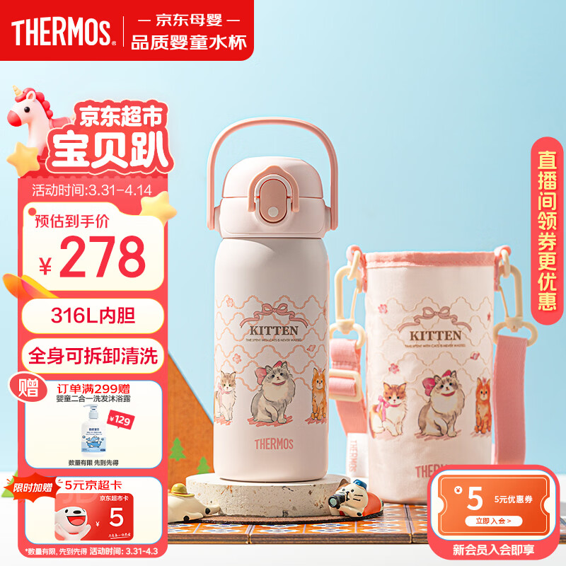 膳魔师小学生316L不锈钢吸管杯安全锁扣幼儿园儿童开学水杯460ml 粉