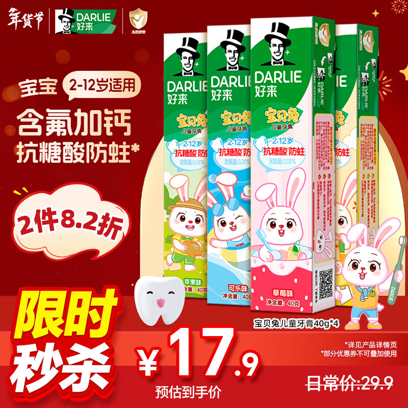 DARLIE好来(原黑人)宝贝兔儿童牙膏套装2-3-6-12岁 40gx4 含氟防蛀抗糖