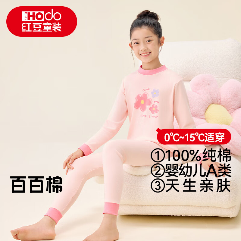 红豆儿童纯棉内衣套装男女童秋衣秋裤秋冬保暖低领棉毛衫M1228浅粉165