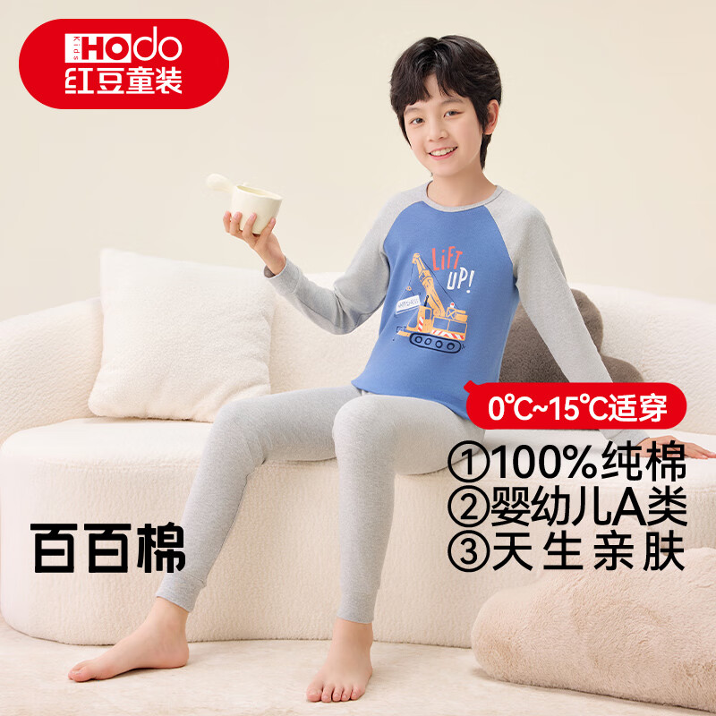 红豆纯棉秋衣秋裤中大童秋冬内衣套装儿童居家睡衣M1119挖掘机120