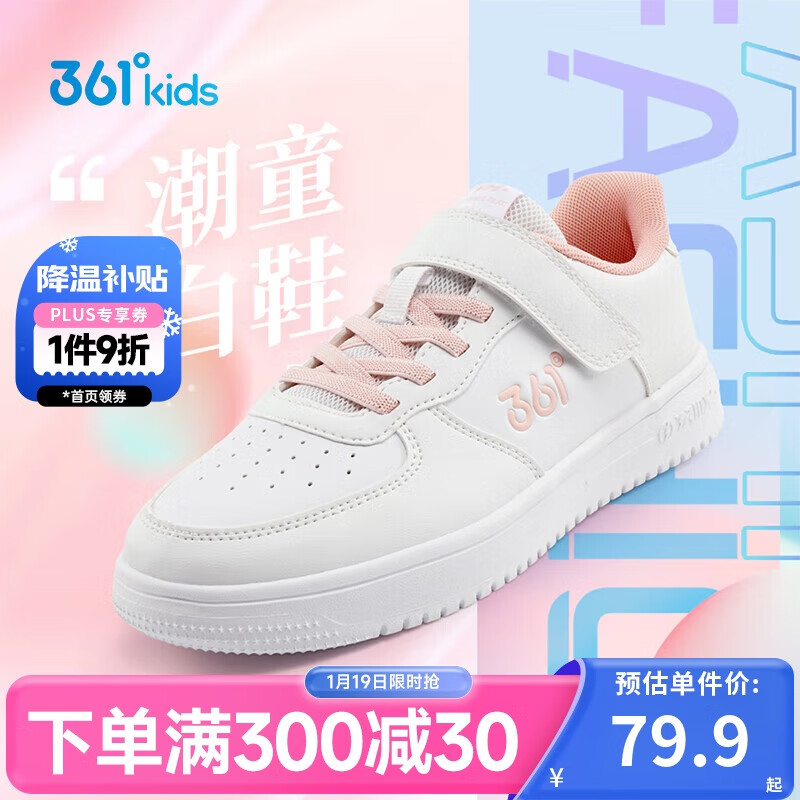 361°儿童四季板鞋男女童(3-12岁)百搭魔术贴滑板鞋小白鞋 粉34