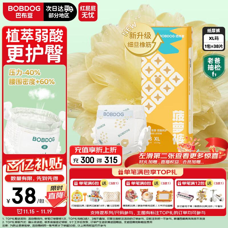 巴布豆(BOBDOG)新菠萝纸尿裤XL号38片(11.5-14KG)婴儿尿不湿 超薄透气 干爽