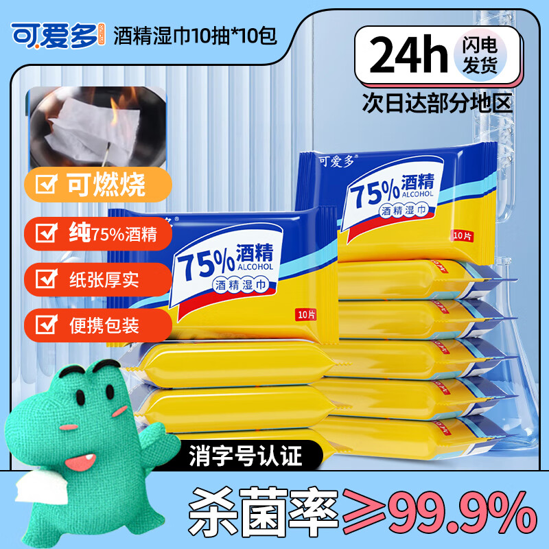 可爱多酒精湿巾75%消毒湿纸巾99.9%杀菌10抽*10包湿巾小包儿童上学专用