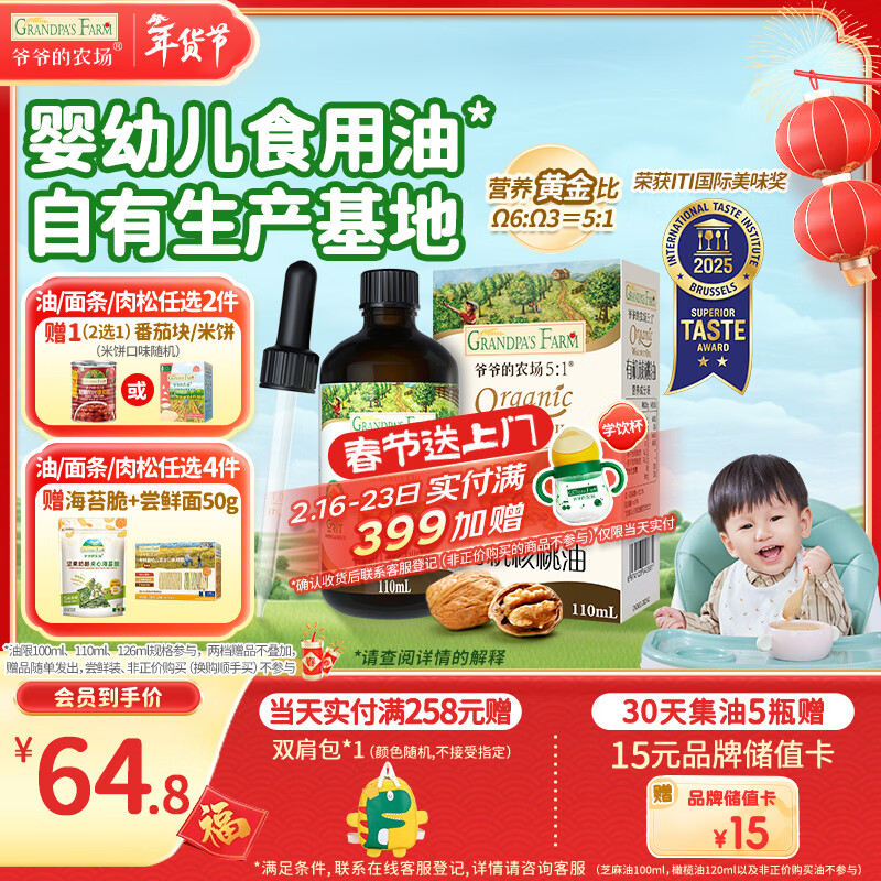 爷爷的农场有机核桃油辅食油110ml 凉拌热炒婴幼儿食用油宝宝辅食6个月以上