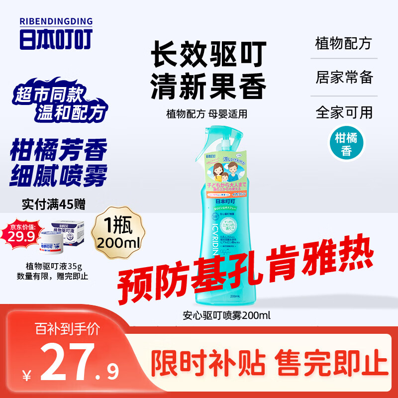 日本叮叮安心驱叮防叮喷雾户外防叮咬花露水柑橘香200ml防基孔肯雅热