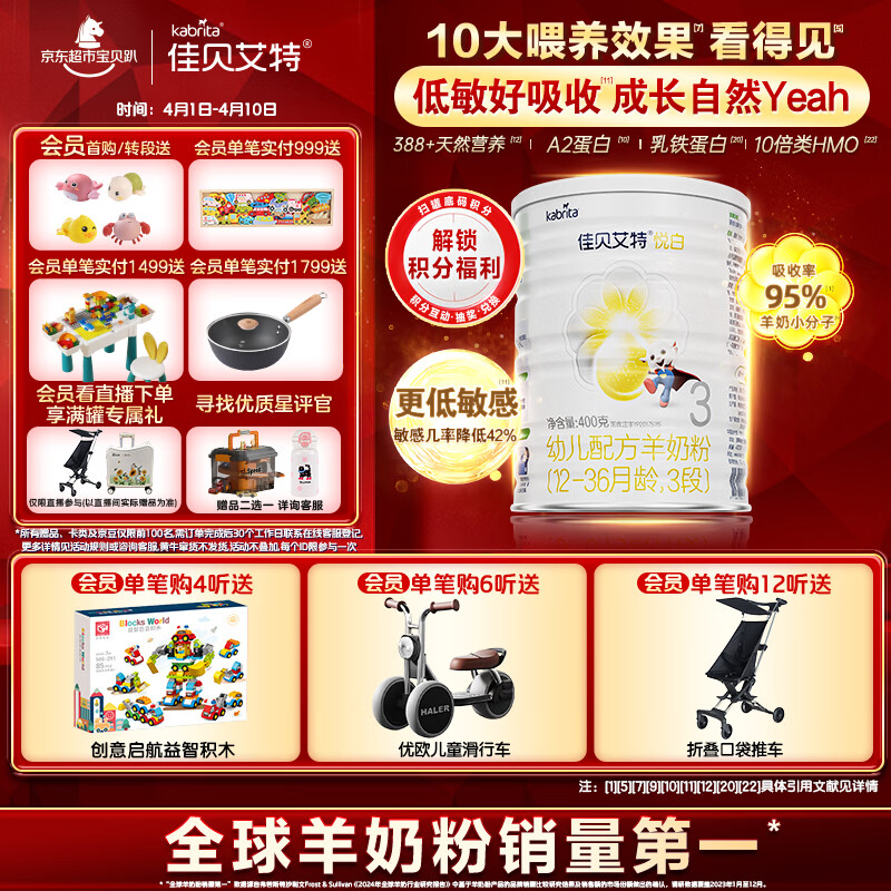 佳贝艾特(Kabrita)悦白婴幼儿配方羊奶粉 3段(1-3岁)400克 天然A2蛋白