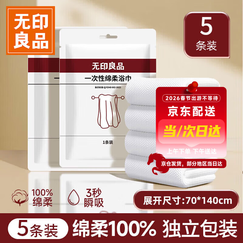 无印良品一次性浴巾儿童加大加厚独立装强吸水酒店旅游必备70*140cm 5条装