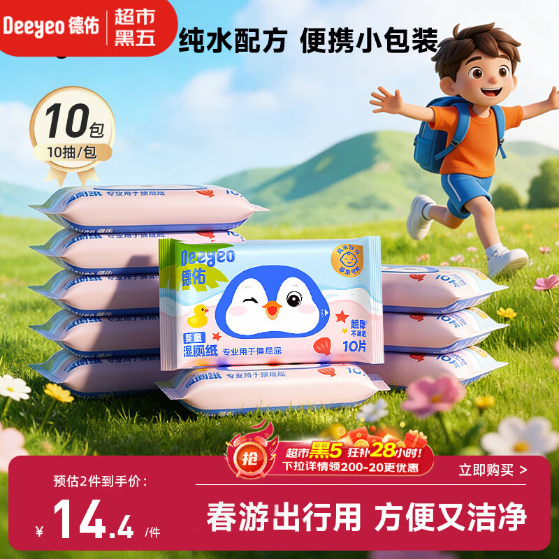 德佑婴童纯水湿厕纸小包10抽10包 洁厕湿纸巾上学出行便携装清爽湿擦