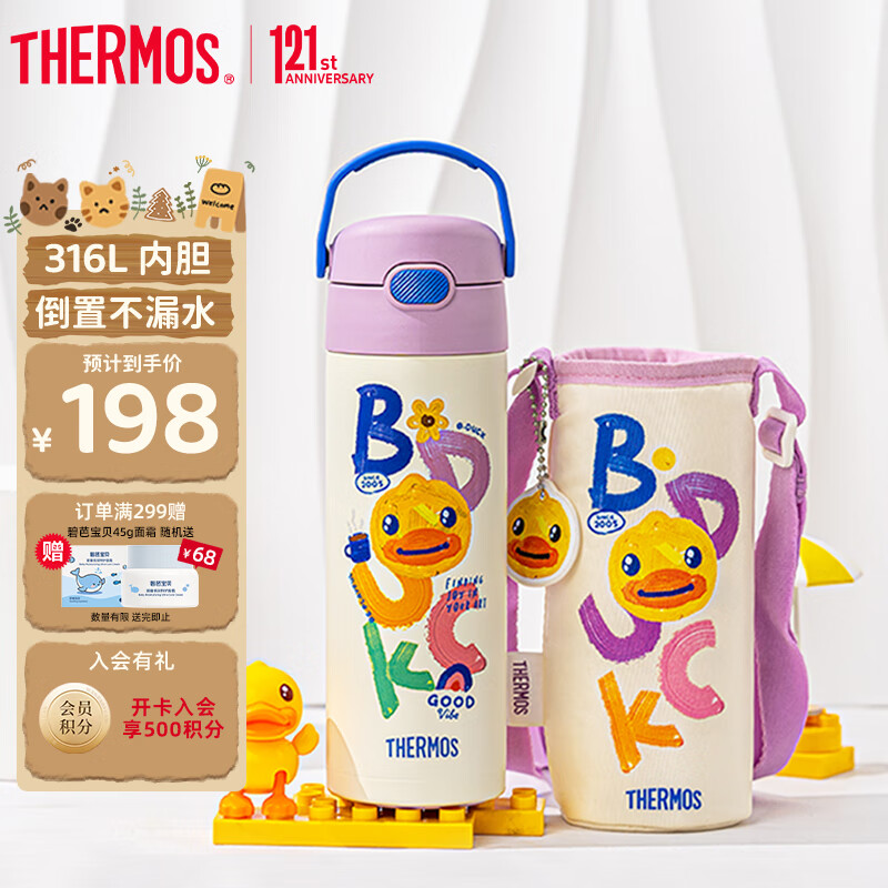膳魔师儿童保温杯直饮水杯小学生开学必备水壶小黄鸭含杯套500ml紫