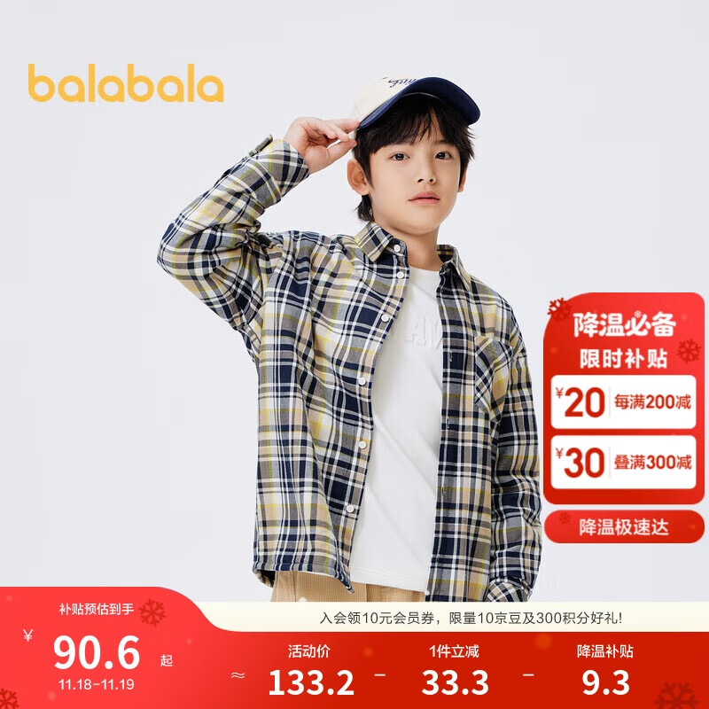 巴拉巴拉童装男童衬衫长袖中大童格子印花衬衣秋冬2024上衣潮208424102101