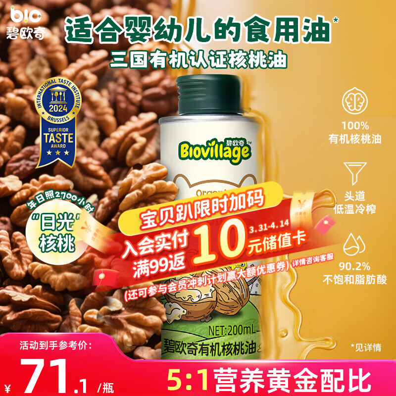 碧欧奇有机核桃油200ml 宝宝辅食用油 凉拌热炒6个月以上适合婴幼儿