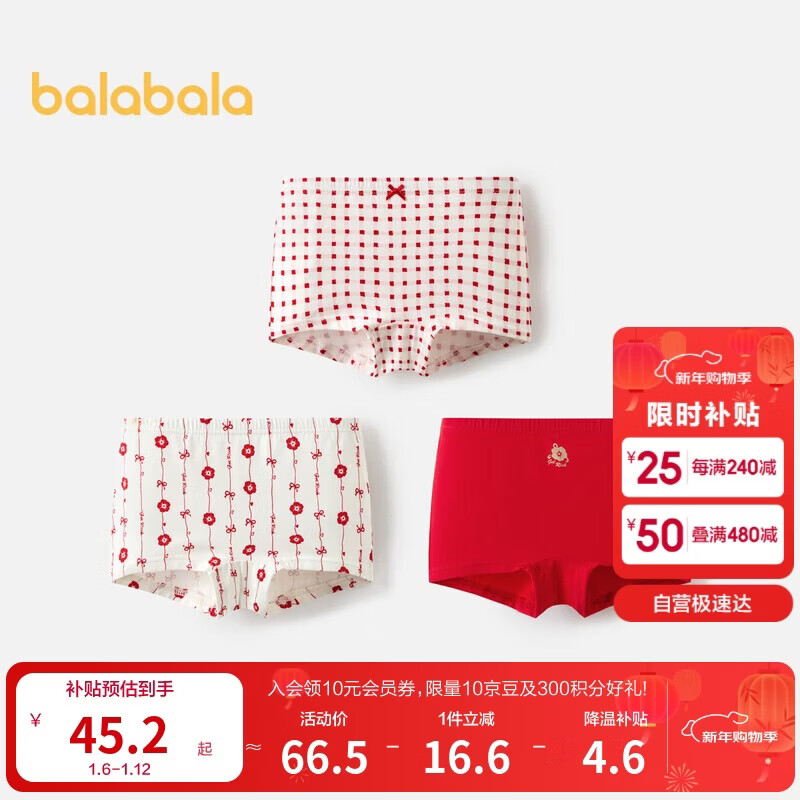 巴拉巴拉女童内裤平角棉本命年红色短裤四角蛇年新年款三条装208125170002