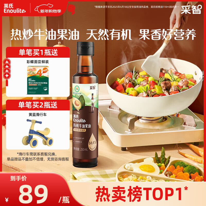 英氏有机牛油果油250ml辅食用油热炒佐餐食用油送6个月以上婴儿辅食