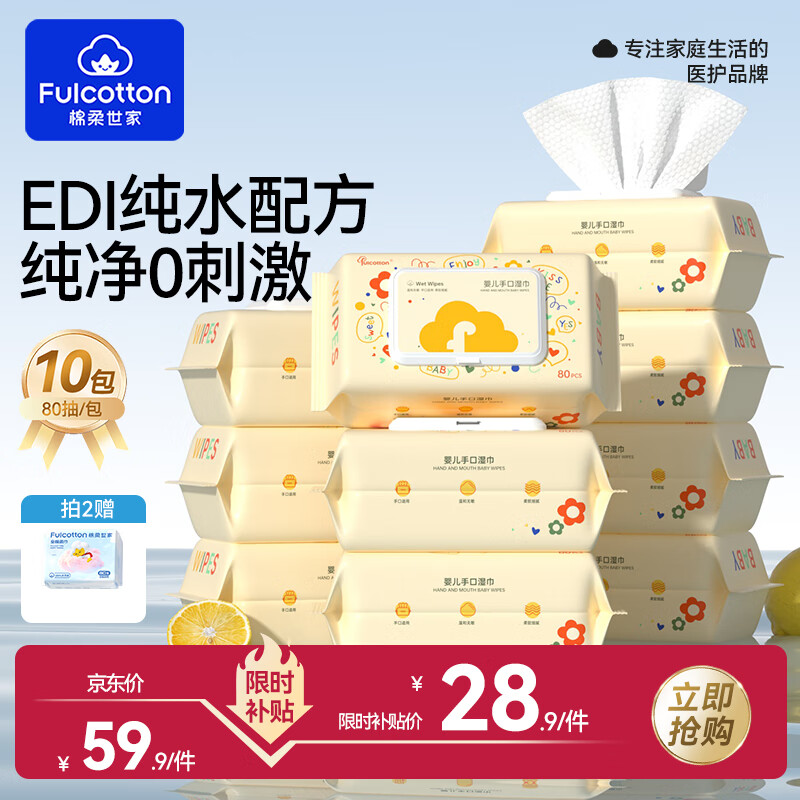 Fulcotton 棉柔世家 婴儿手口湿巾80抽*10包 新生儿加厚湿纸巾护肤柔湿巾纸