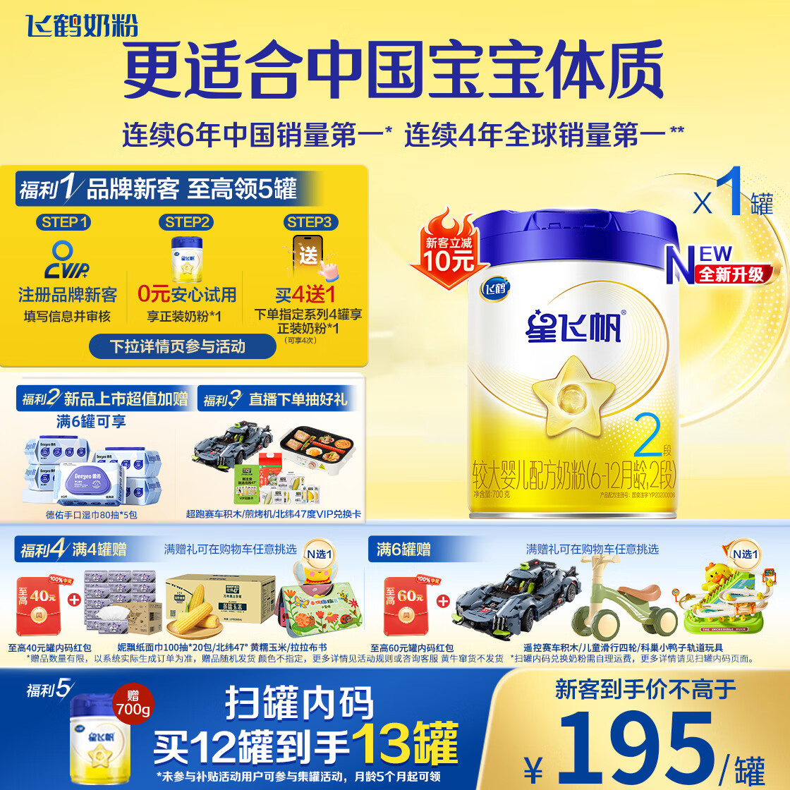 飞鹤星飞帆 婴幼儿配方奶粉2段(6-12月龄) 700g 专利OPO 育儿补贴