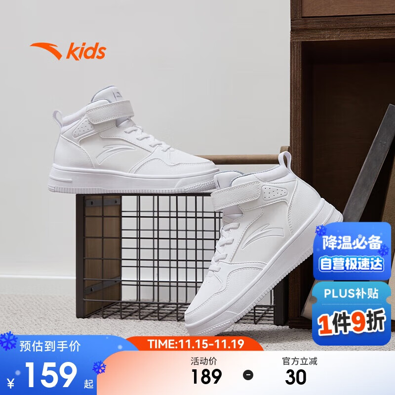 安踏儿童运动鞋男大童生活系列魔术贴高帮小白鞋板鞋A12438004