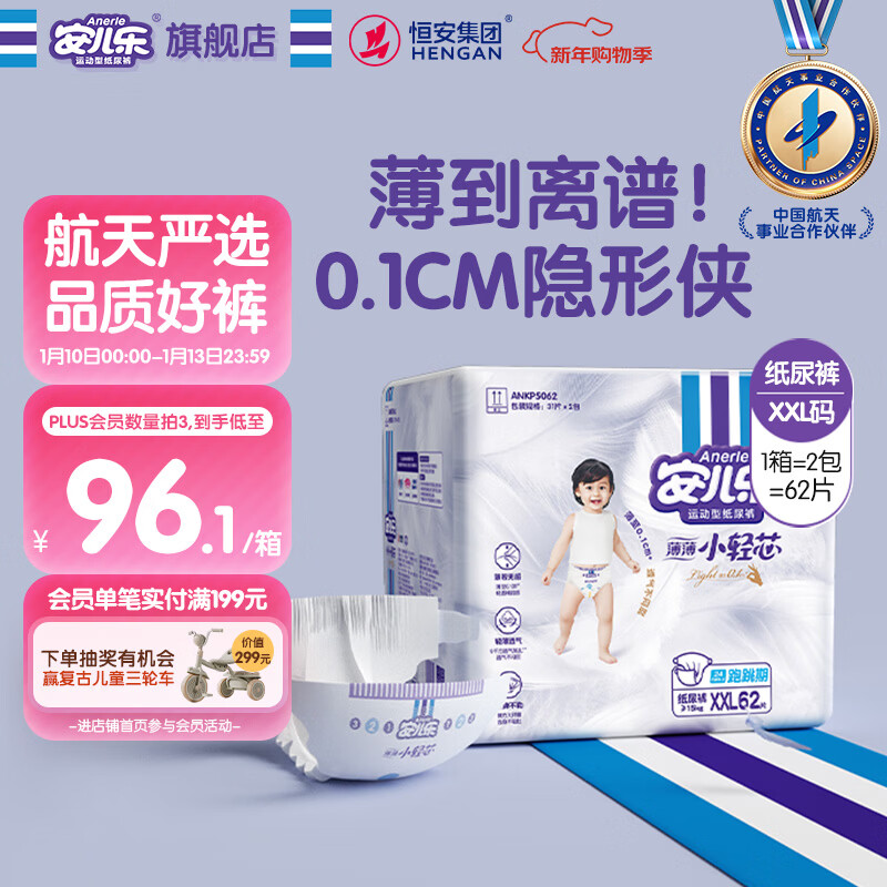 安儿乐(Anerle)小轻芯纸尿裤XXL62片(15kg以上)婴儿尿不湿【品牌直供 安心品质】