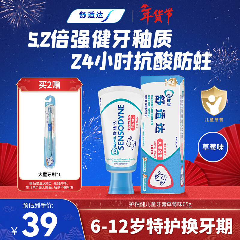 舒适达护釉健儿童牙膏6-12岁防蛀含氟65g草莓味护龈固齿 热门商品