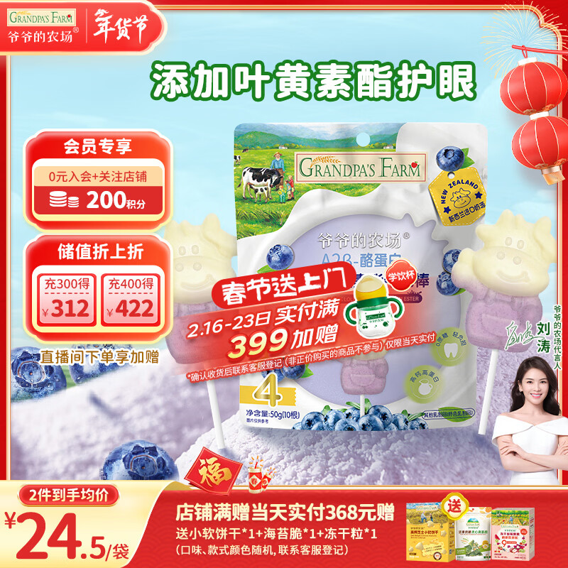 爷爷的农场A2β-酪蛋白蓝莓叶黄素酯高钙牛乳棒儿童宝宝零食牛奶棒棒糖50g