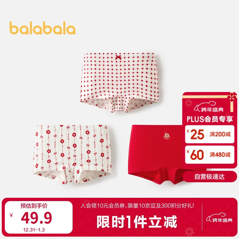 巴拉巴拉女童内裤平角棉本命年红色短裤四角蛇年新年款三条装208125170002