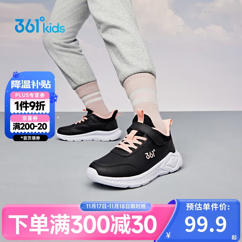 361°童鞋 儿童运动鞋25冬季男女童3-14岁皮革校园跑鞋 黑35