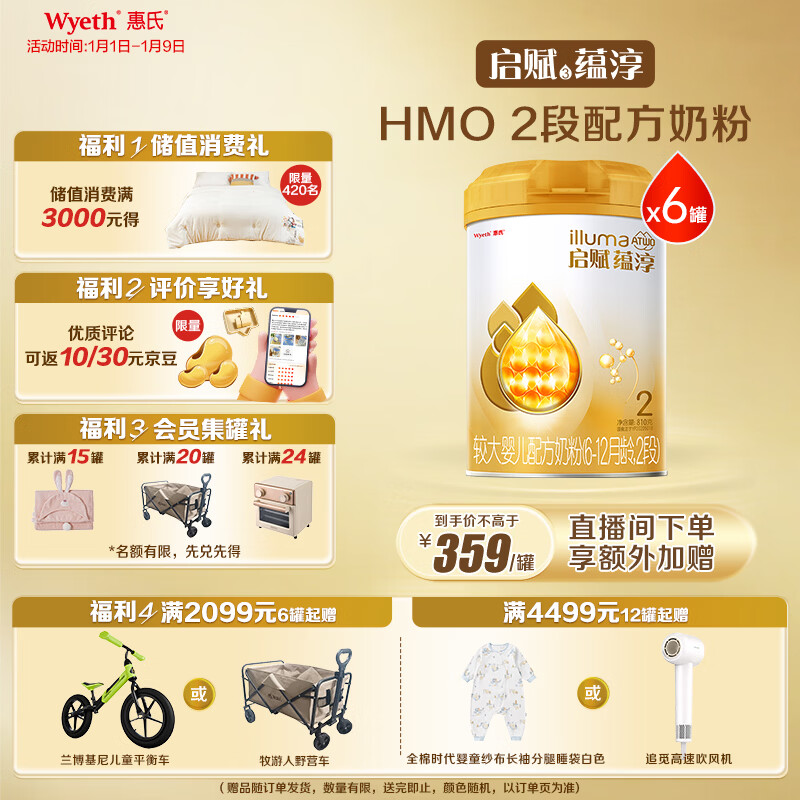 惠氏(Wyeth)启赋蕴淳A2进口HMO较大婴儿配方奶粉2段(6-12月)810g*6罐